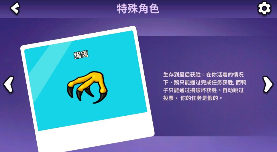 猎鹰是最为特殊的中立角色,必须要存活在最后才能获得胜利。鹅阵营与鸭阵营在对方全灭后游戏都不会结束,必要通过投票或者刀杀掉...